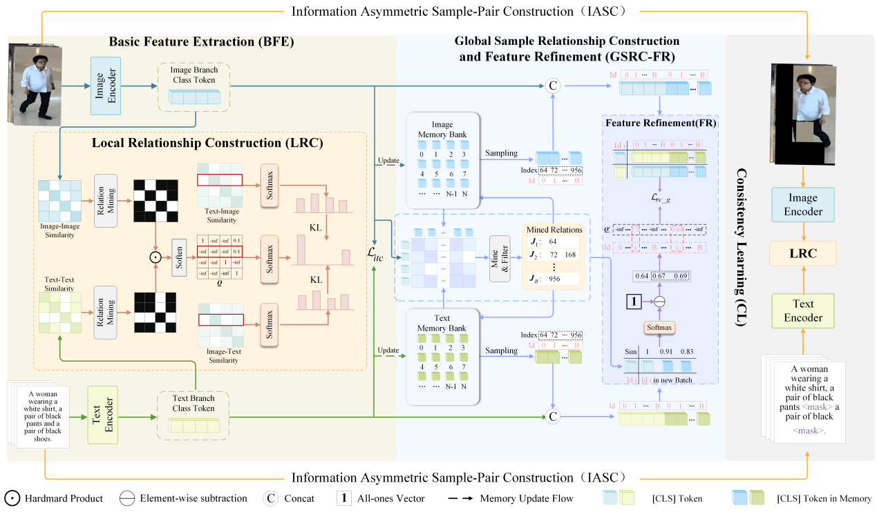 论文简介:弱监督文本到图像的行人匹配是减少模型对大规模人工标注样本依赖的重要方法,具有重要的研究价值。然而,现有方法难以预测复杂的一对多身份关系,严重限制了模型性能的提高。为了应对这一挑战,提出了一种局部和全局双粒度身份关联机制来克服这些瓶颈。具体来说,在局部层面,明确建立批次内的跨模态身份关系,加强不同模态之间的身份约束,使模型能够更好地捕捉细微差别和相关性。在全局层面,构建了一个以视觉模态为锚点的动态跨模态身份关联网络,并引入了一种基于置信度的动态调整机制,有效增强了模型识别弱关联样本的能力,同时提高了整体敏感度。此外,还提出了一种信息不对称样本对构建方法,结合一致性学习来解决难样本挖掘问题,以增强模型的鲁棒性。实验结果表明,所提出的方法大大提高了跨模态匹配的准确性,为文本到图像的行人匹配提供了高效实用的解决方案。