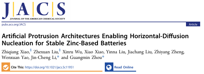 近日,三亿体育_三亿(中国)一站式服务官方网站化学工程学院李金成副教授与清华大学深圳国际研究生院周光敏副教授合作,在高性能锌基水系电池研究方面取得重要进展,相关研究成果以“Artificial Protrusion Architectures Enabling Horizontal-Diffusion Nucleation for Stable Zinc-Based Batteries”为题发表在化学领域顶级期刊Journal of the American Chemical Society上。
