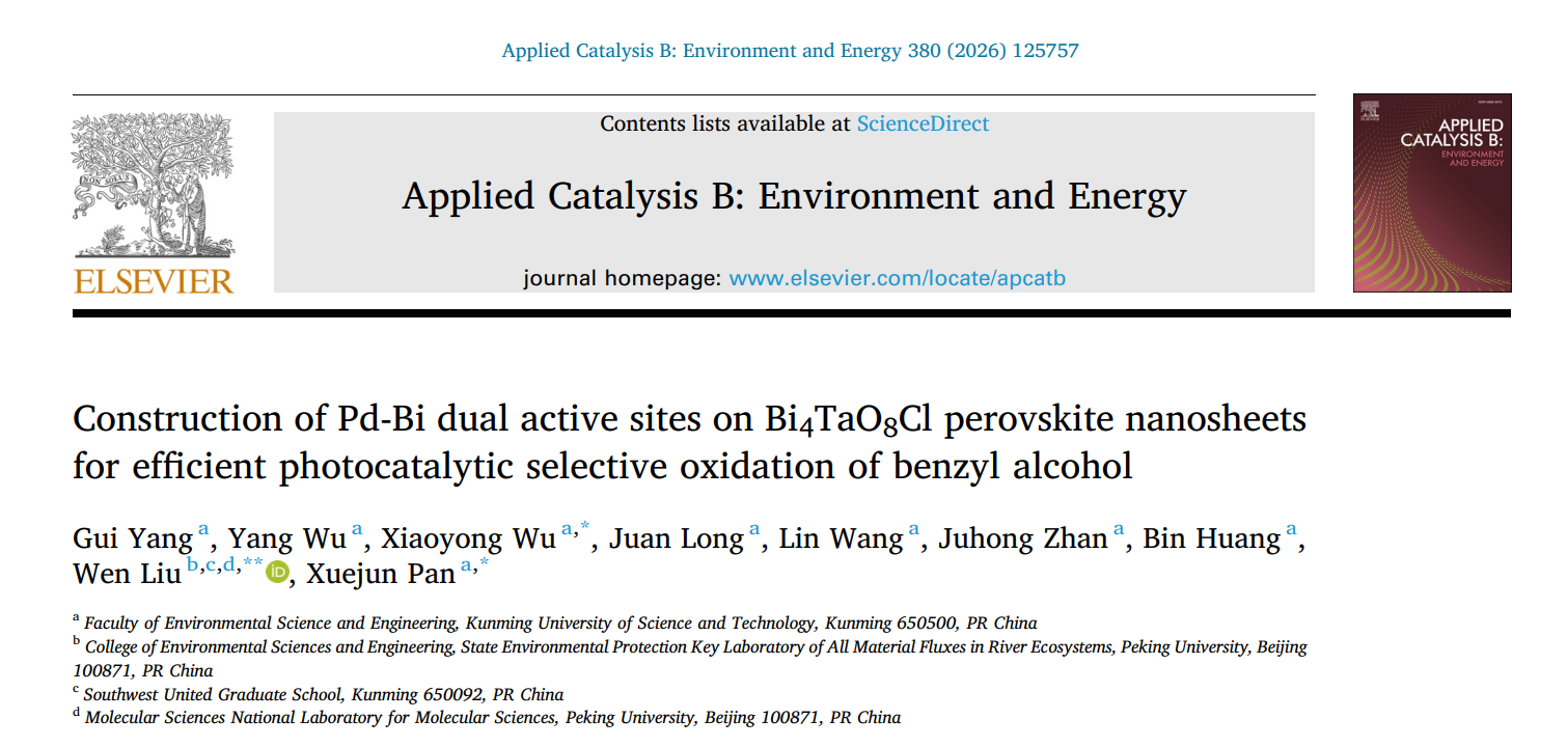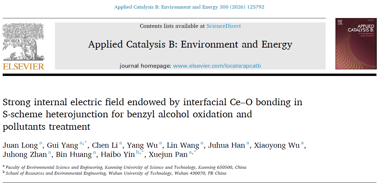 近日,三亿体育_三亿(中国)一站式服务官方网站环境科学与工程学院潘学军教授团队在光催化选择性氧化反应机制与污染物降解应用方面连续取得两项突破性成果,相关成果分别以“Strong internal electric field endowed by interfacial Ce–O bonding in S-scheme heterojunction for benzyl alcohol oxidation and pollutants treatment”和“Construction of Pd-Bi dual active sites on Bi4TaO8Cl perovskite nanosheets for efficient photocatalytic selective oxidation of benzyl alcohol”为题,发表在环境与能源领域国际权威期刊Applied Catalysis B: Environment and Energy上。