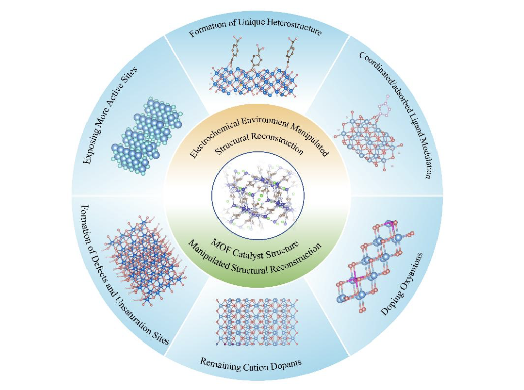 催化与能源领域一直是广泛研究的焦点,而配位化学在解决相关领域中部分最紧迫的全球性挑战方面发挥着关键作用。金属有机框架(MOFs)材料凭借高催化效率、可调谐纳米结构、暴露的金属活性位点等优势,在OER催化领域展现出巨大潜力。研究发现,MOF在电化学环境中的动态重构过程受多种因素调控,其结构演变与催化活性之间的构效关系尚未明确,这极大地阻碍了高性能MOF基催化剂的定向设计。针对这一关键科学问题,胡觉教授在综述中系统梳理了MOF基OER电催化剂动态重构领域的最新研究进展,首次从“电化学环境调控”与“MOF结构调控”双维度,深入剖析了触发MOF重构的核心因素,前者包括电解质、电压、反应中间体、温度压力等外部条件,后者涵盖MOF的形貌、组成元素、金属中心配位环境、电子结构等内在属性,明确了多因素协同作用下MOF的重构路径及其演化规律。该综述的发表不仅为MOF电催化剂动态重构研究提供了全面的学术参考,也为后续继续围绕MOF材料的结构设计、重构调控与性能优化开展研究提供了方向,助力新能源催化技术实现突破。