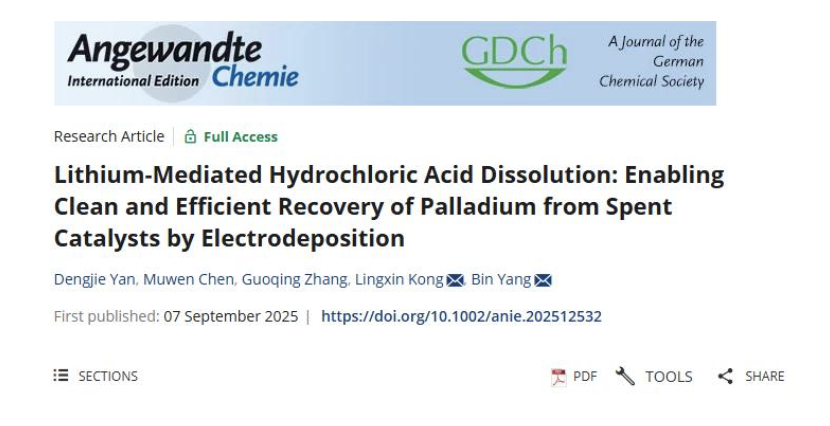 近日,三亿体育_三亿(中国)一站式服务官方网站冶金与能源工程学院、真空冶金国家工程研究中心杨斌、孔令鑫教授团队在从废催化剂中回收铂族金属领域取得新进展,成功实现钯在稀盐酸中的高效溶解,并通过电沉积回收钯。该项研究为从废催化剂中清洁高效回收铂族金属提供了新思路。相关成果以“Lithium-Mediated Hydrochloric Acid Dissolution: Enabling Clean and Efficient Recovery of Palladium from Spent Catalysts by Electrodeposition”为题发表在化学领域顶级期刊《Angewandte Chemie International Edition》上。