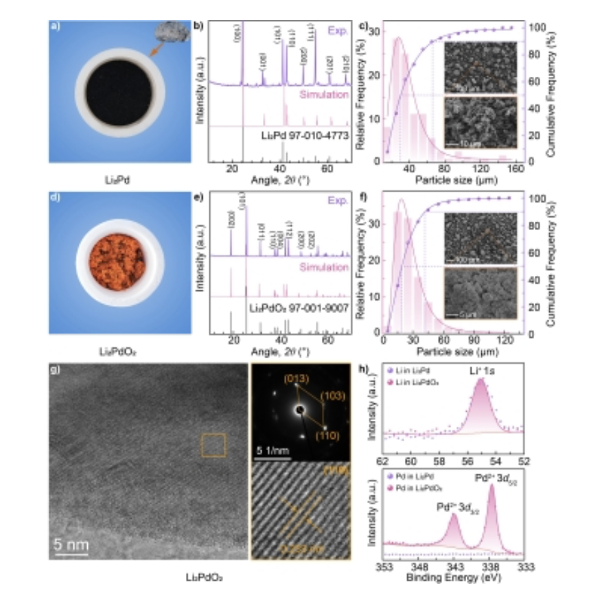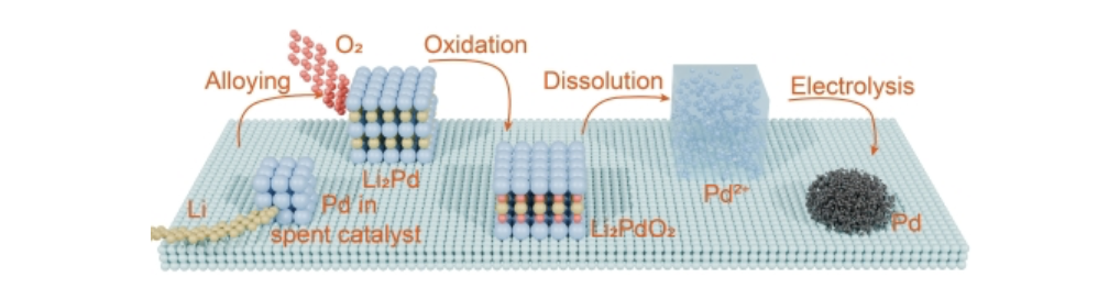 钯是重要的战略金属,全球资源储量仅约6.9万吨,而我国储量不到全球1%。钯具有独特的催化活性和高温稳定性,约70%用于生产汽车尾气净化催化剂。从失效汽车尾气净化催化剂中回收铂族金属常规火法和湿法工艺存在能耗高、效率低、环境影响大等瓶颈问题,严重制约了催化剂行业的可持续发展。针对上述挑战,三亿体育_三亿(中国)一站式服务官方网站杨斌、孔令鑫教授团队提出了“锂介导相变-常温常压酸溶-可控电沉积”回收钯的新思路。通过密度泛函理论计算与实验验证,首次揭示并实现“Pd0 → Li2Pd (Pdᵟ-) → Li2PdO2(Pd2+)”的精准可控相变。Li2PdO2具有独特的Pd2+-O2-配位结构,在稀盐酸中即可实现秒级快速溶解,彻底解决了常规工艺溶解钯对强氧化剂(如H2O2、NaClO3等)或高温高压的依赖。并通过高效、可控电沉积(Pd2+→Pd0),一步实现钯的回收。该项研究为从废催化剂中清洁高效回收铂族金属开辟了新途径。