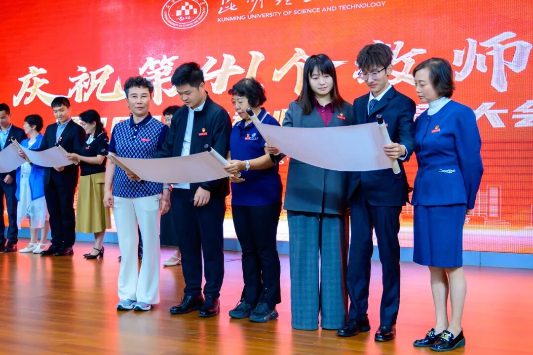 校党委副书记、校长王华,校党委副书记蔡金红分别宣读了2024年教师节以来国家级获奖集体和个人、云南省人才称号、云南省及有色金属工业科技奖励及国家自然科学基金获批人员,省部级、司局级、地厅级、行业协会等类别及校级荣誉奖励集体和个人名单。与会校领导为获奖代表颁发荣誉证书。