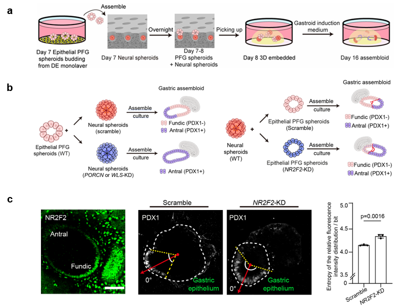 鉴于人类早期胚胎样本的匮乏与相关遗传学操作的伦理限制,本研究建立的类胃囊还为揭示人类胃器官早期发育的调控机制提供了全新的体外研究平台。为进一步解析胃发育中的谱系特异性调控机制,研究人员基于类胃囊和神经信号中心理论提出了“人工信号中心”驱动的“乐高式”发育重构策略,建立了微尺度组织定向组装技术,精准实现胃类器官前体与神经信号中心的一对一非对称组装(图2)。通过利用该技术对类胃囊中不同谱系的组织模块独立开展基因编辑,研究团队发现上皮源NR2F2是决定胃组织非对称图式发育的关键因子,其缺失可导致胃底-胃窦发育失衡,提出了胃组织图式及其发育异常的一个新机制,充分体现了类胃囊技术在人类器官发育与重构的基础研究与转化研究上的巨大潜力。