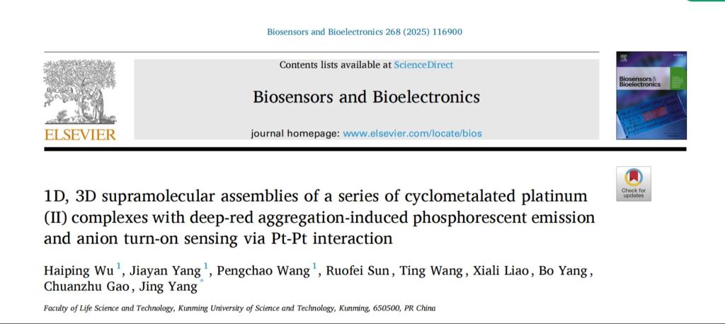 近日,生命科学与技术学院超分子药物化学课题组杨靖副教授在环金属钯 (II) 配合物在生物环境诱导自组装与磷光传感领域取得了新进展。相关研究成果以“Turn on emissive 3D nanosphere self-assembled by a novel series of cyclometallated palladium (II) complexes with GSH in solution and phosphorescent 1D nanowires of complex via Pd-Pd interaction”为题发表在国际著名生物传感期刊《Biosensors & Bioelectronics》上。