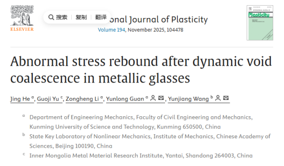 近日,三亿体育_三亿(中国)一站式服务官方网站建筑工程学院郭然/官云龙课题组(计算力学团队)在金属玻璃动态力学响应方向取得重要研究进展,相关成果以“Abnormal stress rebound after dynamic void coalescence in metallic glasses”为题,发表在塑性力学领域国际顶级期刊《International Journal of Plasticity》上。