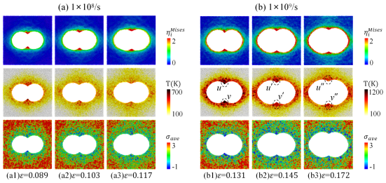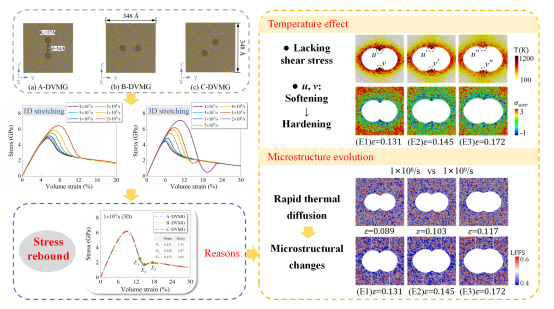 然而,在3D动态加载下,孔洞合并后,孔洞周围的温度呈现出降低趋势,且这一趋势随着加载应变率的提升变得越来越显著。从原子堆垛的角度来看,随着孔洞周围温度的降低,力学稳定的<0,0,12,0>原子Voronoi多面体团簇的数量会恢复。在非晶结构中,<0,0,12,0>团簇的含量越高,金属玻璃材料的强度也会相应越高,因此,金属玻璃在孔洞合并后会经历异常的应力回跳现象,产生了意外的微观结构硬化效应。但是,这一效应在晶态金属中并不存在。此外,团队的进一步研究也证实了应力回跳的强度可以通过调整孔洞特性或材料参数来控制。这种不寻常的应力回跳现象的揭示将对金属玻璃及其符合材料的极端条件应用具有重要的工程价值。