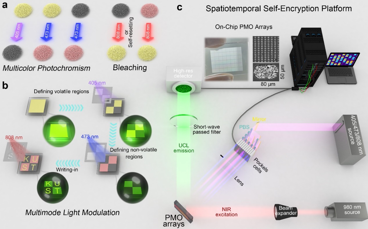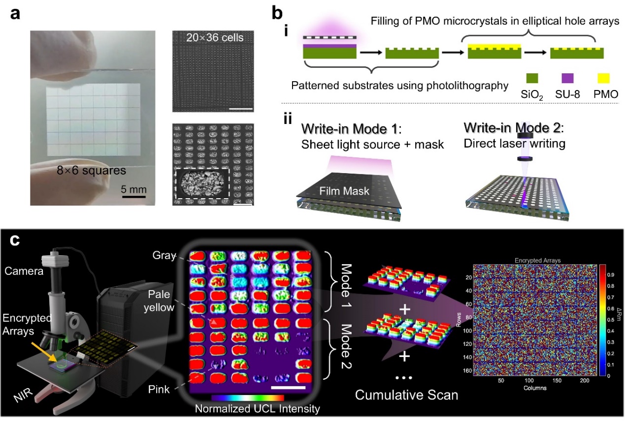 通过光刻技术,研究团队还将PMO微晶材料集成到光学芯片上,开发了集成光学阵列。这些阵列不仅能够实现多种加密模式,还能通过硬件级别的加密保障信息的安全存储。与传统的软件加密系统不同,这一技术通过在光学材料中直接实现加密,不仅提高了安全性,还能有效防止信息被破解和篡改。