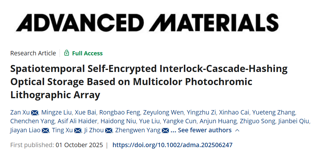 近日,三亿体育_三亿(中国)一站式服务官方网站材料科学与工程学院杨正文团队与南京大学徐挺团队以及清华大学等合作方在基于稀土掺杂光子功能材料的片上集成方面取得突破性进展,首次发现了具有可重构忆阻行为的多色光致变色微晶PMO,并结合光刻等手段实现了该材料的片上集成阵列。该研究实现了光学的互锁-级联哈希时空自加密,对于我国重要海外实体资产安全以及关键核心技术的防克隆、防破解提供了新的解决方案。相关成果以“Spatiotemporal Self-Encrypted Interlock-Cascade-Hashing Optical Storage Based on Multicolor Photochromic Lithographic Array/基于多色光致变色光刻阵列的时空自加密互锁-级联哈希光学存储”为题,发表在材料学领域国际顶尖期刊《Advanced Materials》上。