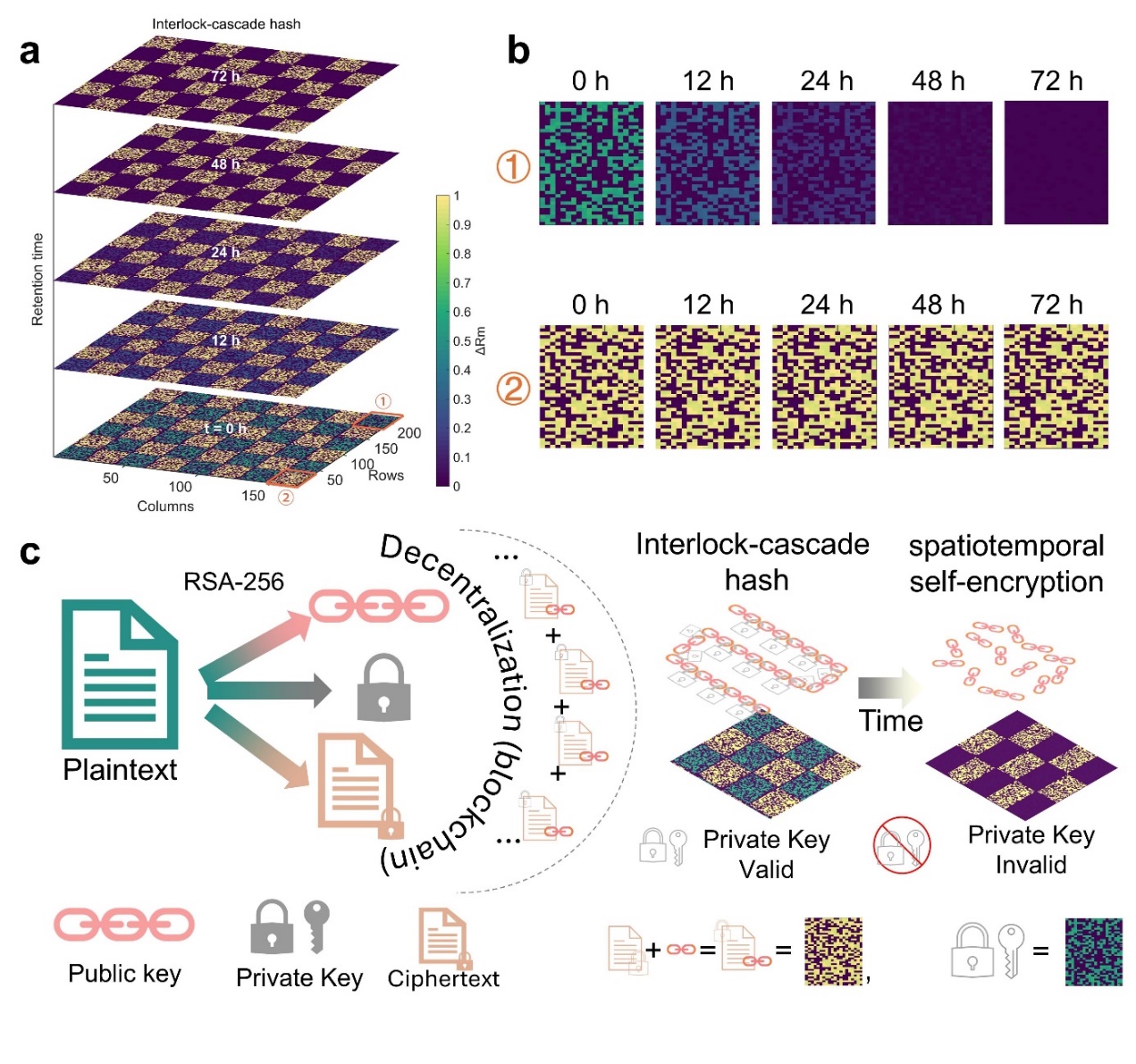 PMO的多色光致变色特性,不仅使得其在不同波长光源下的颜色状态变化互不干扰,还能为信息存储提供独特的安全性。研究团队利用这一特性提出了时空自加密光学信息存储方案。在该方案中,不同的光致变色通道(灰色和粉色通道)分别用于存储不同需求的加密信息(不可公开的私钥/可公开的公钥+明文),每个信息块只能在特定的时间窗口内解密,超出时间限制后,信息将物理意义上的“蒸发”。该设计需要定时授权,而时间窗口则保证以目前超级计算机的算力无法破解。