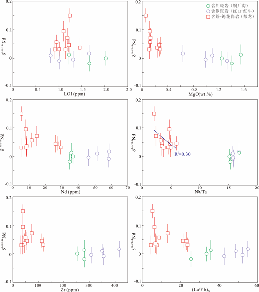 图3 不同构造背景下镁铁质岩石与含矿花岗质侵入体的稳定Nd同位素对比图