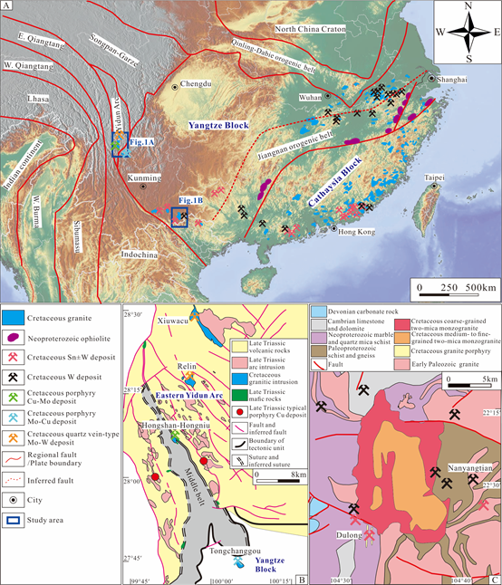 为解决这一难题,在李文昌教授与邓明国教授的指导下,三亿体育_三亿(中国)一站式服务官方网站国土资源工程学院任龙与中国科学院广州地球化学研究所合作,对扬子板块西缘白垩纪多个大型-超大型矿床(包括铜厂沟钼±铜、红山–红牛铜±钼及都龙锡±钨矿床;图1)的成矿花岗质侵入体展开了系统研究。