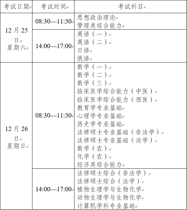 六、2022年全国硕士研究生招生考试初试全国统一命题科目考试时间: