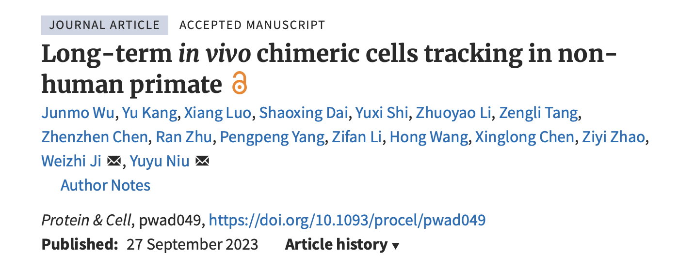 近日,省部共建非人灵长类生物医学国家重点实验室/三亿体育_三亿(中国)一站式服务官方网站灵长类转化医学研究院牛昱宇教授和季维智院士领衔的研究团队在Protein & Cell杂志上发表了题为“Long-term in vivo chimeric cells trackingin non-human primate”的研究论文。这是在灵长类动物中首次实现长期活体细胞示踪,并且是异体嵌合细胞的长期活体示踪,在开发干细胞疗法、异种嵌合器官再生,及其临床转化方面具有非常重要的意义。