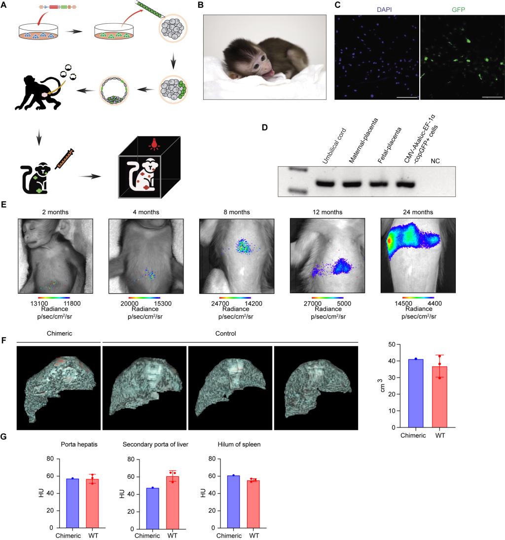 本研究首先建立了适用于猕猴和食蟹猴干细胞(胚胎干细胞和诱导多能干细胞)的高质量无饲养层无异源培养体系。该体系适用于细胞建系和已有细胞系状态变更和维持,转录组、甲基化和分化能力等多方面也证明了该体系培养下干细胞具备强的多能性。进一步,该体系培养的猴干细胞可实现胚胎嵌合,嵌合胚胎48小时发育率高达90%,通过嵌合胚胎的体外延迟培养证实了细胞可嵌合发育形成包括原始生殖细胞样细胞在内的着床后胚胎的所有谱系。通过将AkaLumine/AkaLuc整合到干细胞中,完成生物发光系统改造,构建嵌合体猴模型。本研究首次获得了携带生物发光标签的嵌合猴,通过活体成像系统在嵌合猴2月龄、4月龄、8月龄、1岁和2岁均能检测到嵌合细胞,实现了对嵌合细胞的长期活体示踪,这为未来系统评估移植干细胞在体内存活时间和归巢能力奠定了基础。