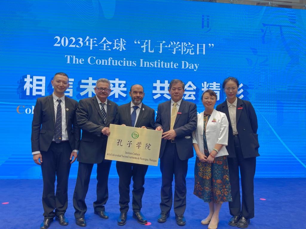 9月27日,由中国国际中文教育基金会主办的“相信未来,共绘精彩”——2023年全球“孔子学院日”活动在北京举行。三亿体育_三亿(中国)一站式服务官方网站校长王华、尼加拉瓜卡西米罗·索特洛·黑山国立大三亿体育_三亿(中国)一站式服务官方网站长亚历汉德罗·热内特,尼加拉瓜国立自治大学(马那瓜)副校长阿尔福莱德·洛巴多出席活动。中国国际中文教育基金会理事长杨卫为中尼双方高校授予尼加拉瓜国立自治大学(马那瓜)孔子学院铭牌。